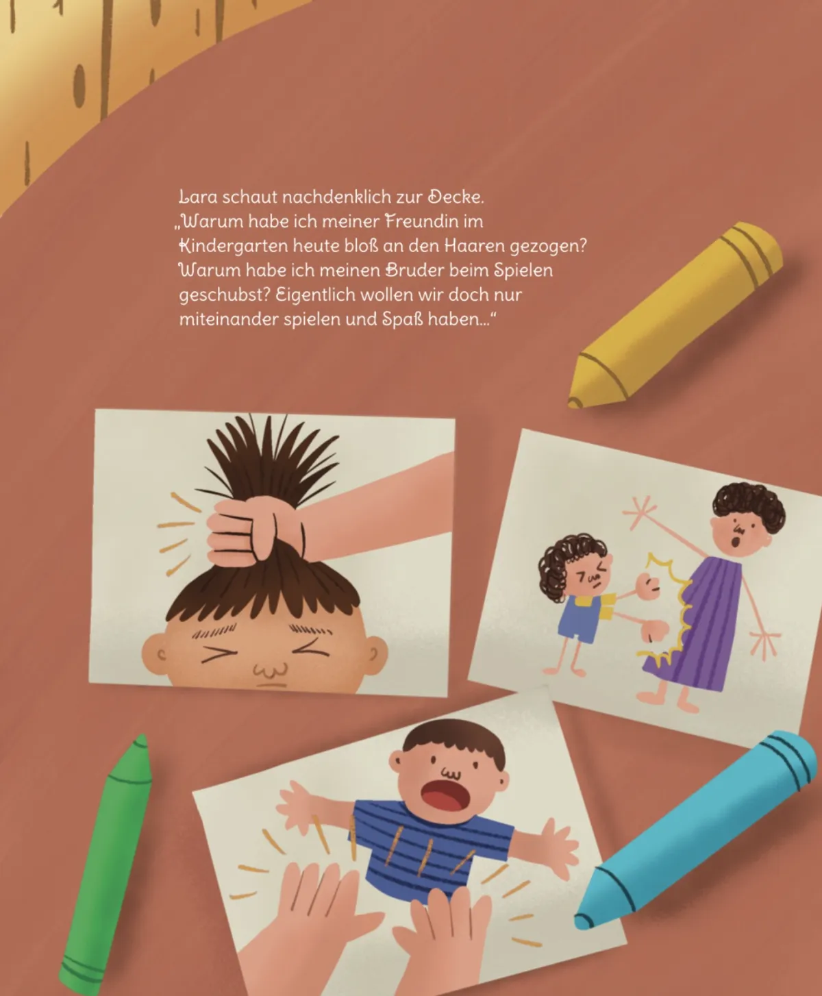 Lara möchte herausfinden, warum sie manchmal Dinge tut, die sie so eigentlich gar nicht möchte, wie ihren Bruder zu schubsen oder ihrer Freundin an den Haaren zu ziehen. Die Geschichte beschreibt erzählerisch den Zusammenhang zwischen Regulation von Emotionen, unserem Nervensystem und unserer Wahrnehmung der Welt. Zudem erfährt Lara praktische Übungen zur Selbst- und Co-Regulation im Alltag.